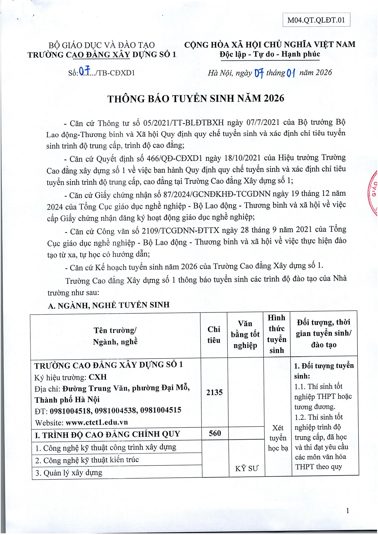 Trường Cao Đẳng Xây Dựng số 1 - CTC1