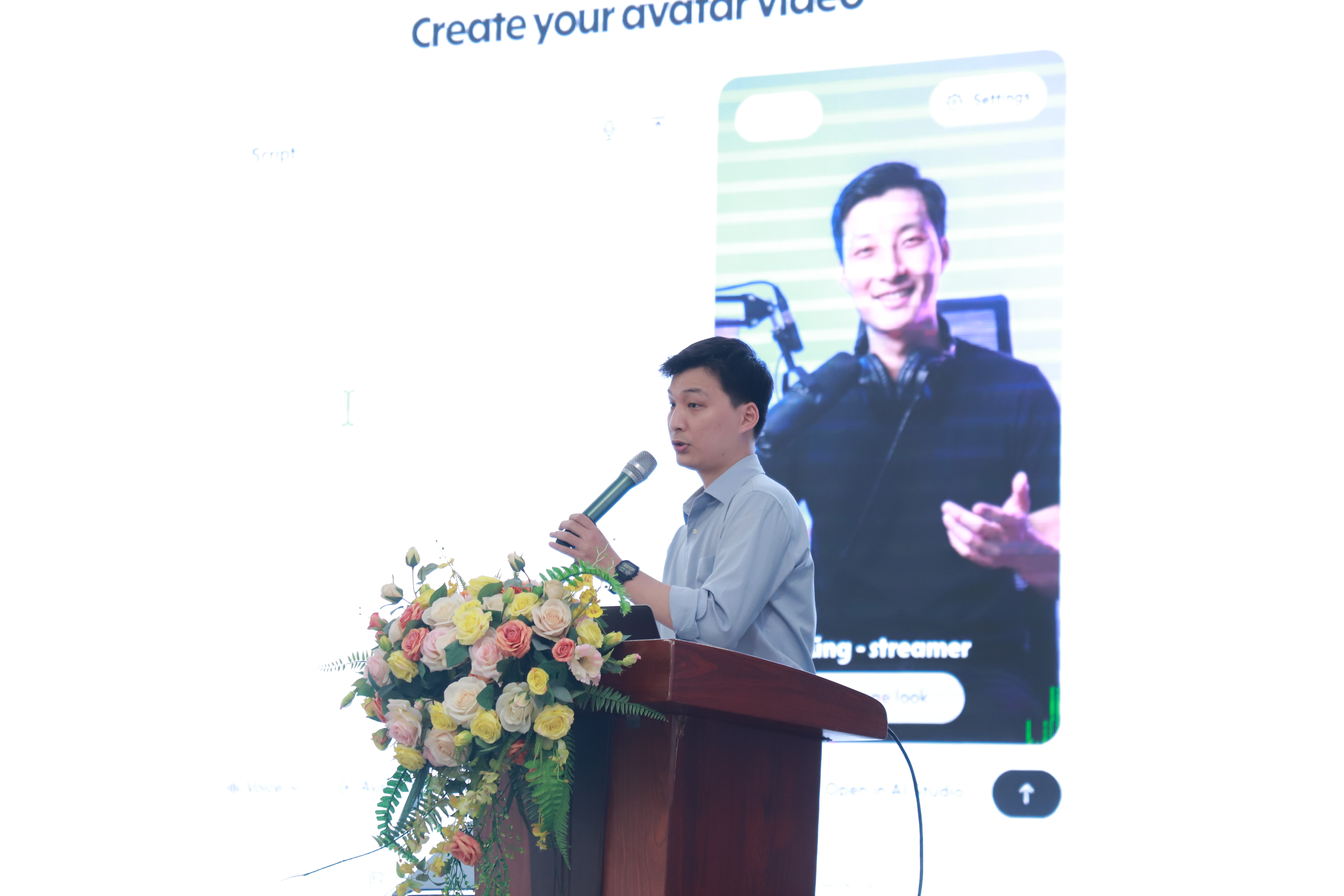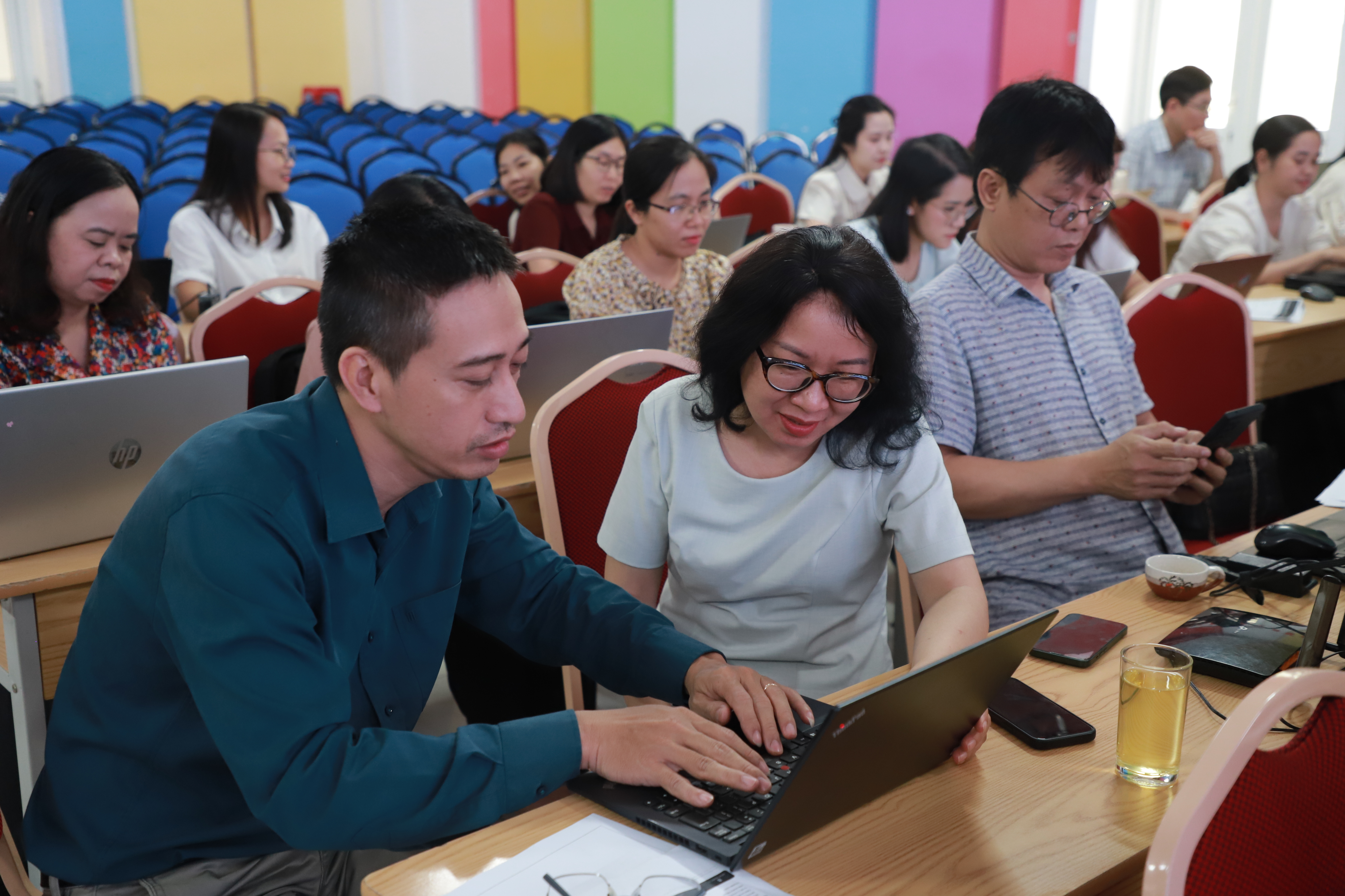 Phần thực hành là một trong những điểm nhấn quan trọng của buổi tập huấn. Các giảng viên, viên chức đã được trực tiếp trải nghiệm các công cụ như ChatGPT, Copilot, Canva AI, Perplexity AI và các phần mềm hỗ trợ thiết kế nội dung, video. Nhiều nhóm đã triển khai thực hành tạo video ngay tại lớp, chia sẻ các ý tưởng sáng tạo về cách ứng dụng AI vào các học phần cụ thể.
